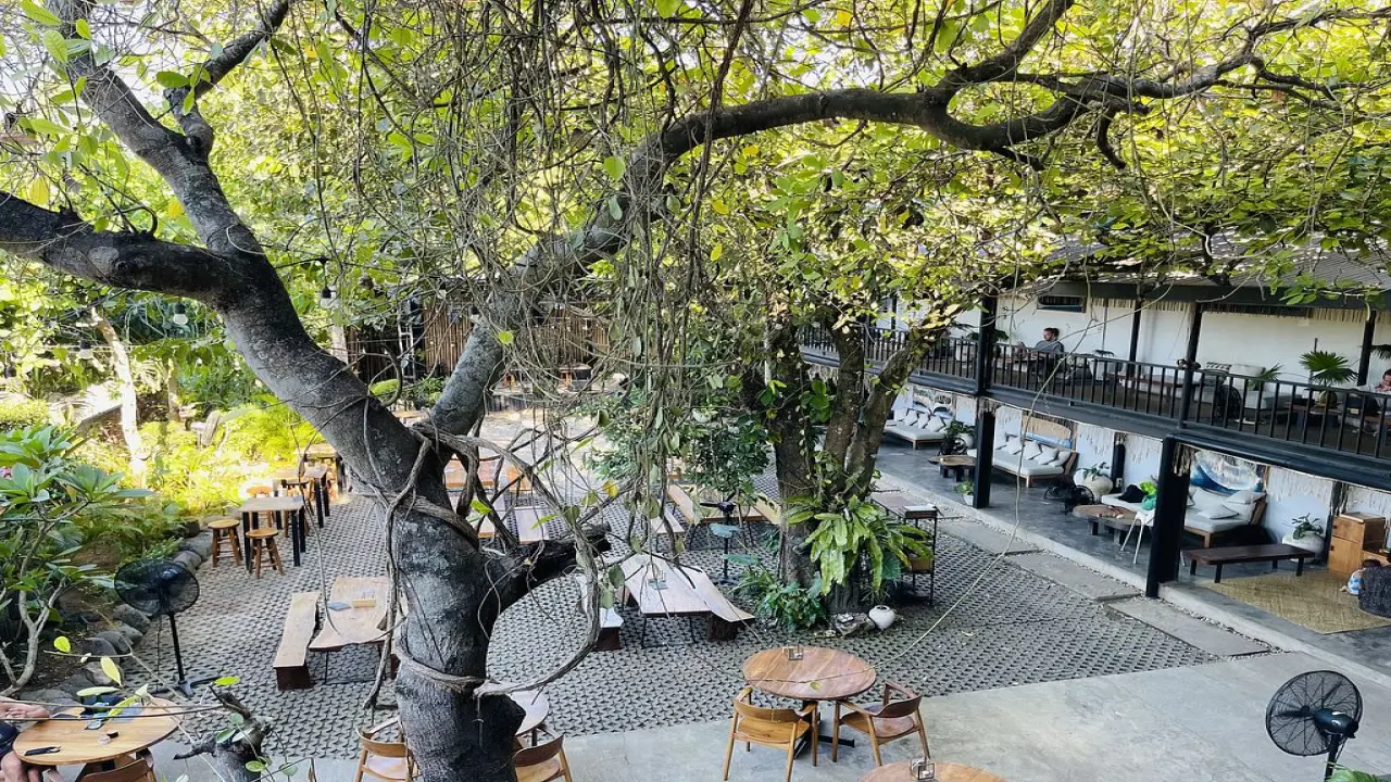 Ulu Garden is an open-air courtyard shaded by leafy trees, with mismatched chairs and a relaxed hum of chatter.