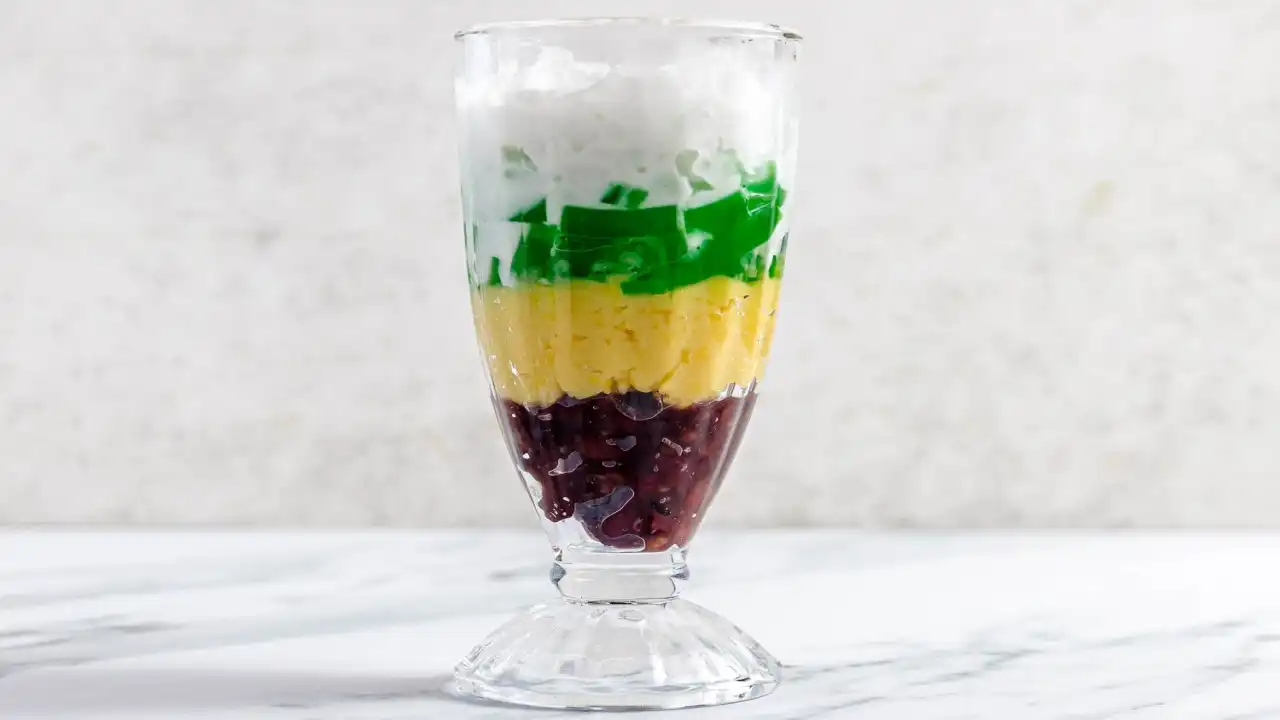 A tall glass stacked with red beans, mung beans, green jelly, coconut milk, and ice. It looks like something made for fun, and honestly, it tastes just as refreshing as it looks.