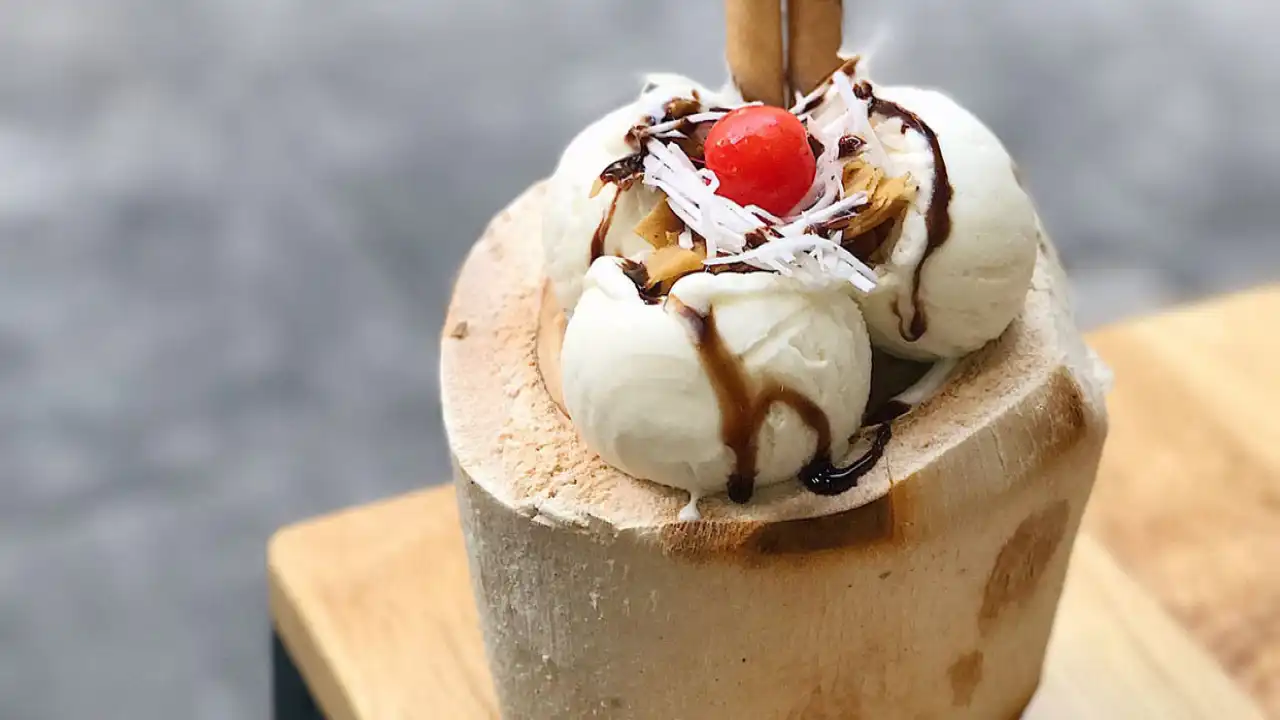 Ice cream served right inside a little coconut shell, usually topped with peanuts, some crunchy bits, and sometimes a scoop of sticky rice if you’re lucky.