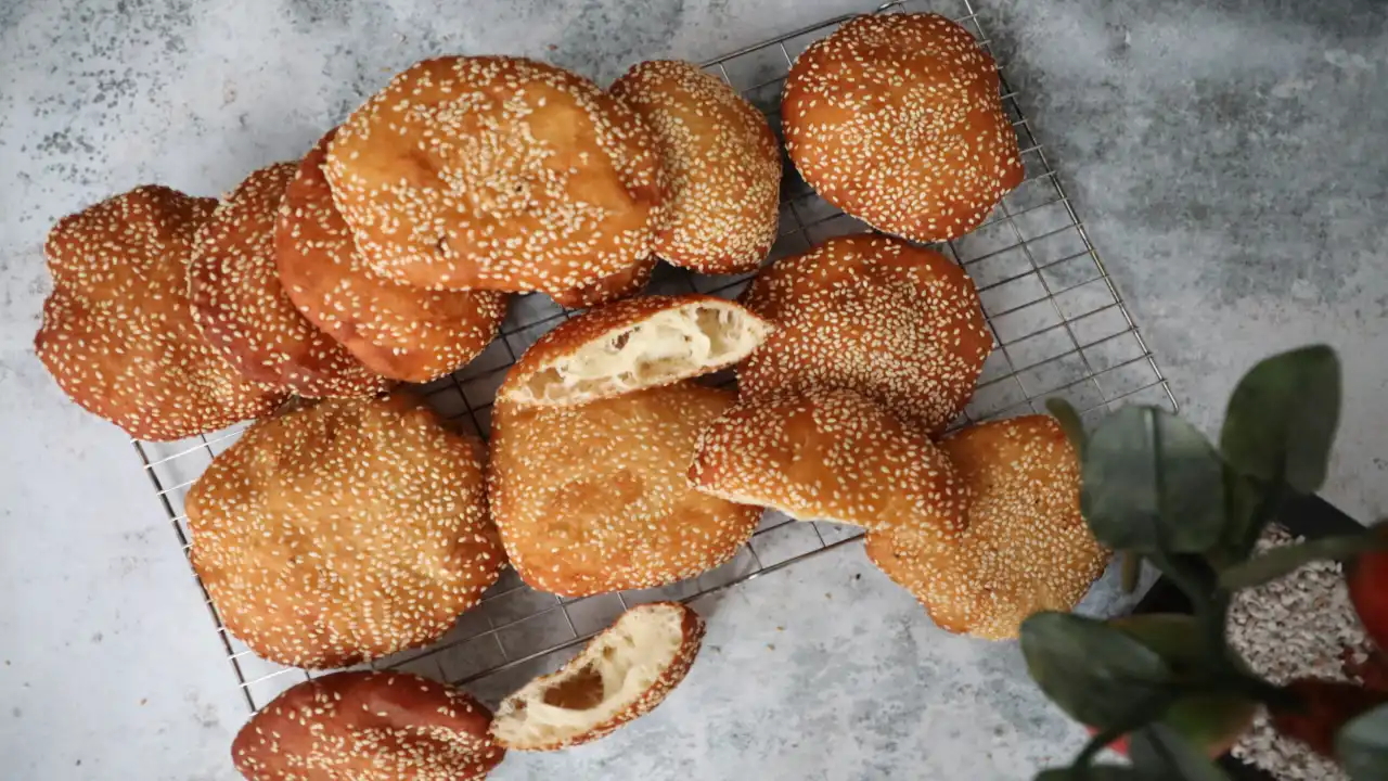 Golden, puffy, lightly sweet, sprinkled with sesame. Best eaten warm right out of the fryer.