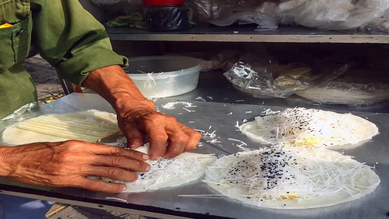 Thin wrappers stuffed with coconut shreds, sugar, and black sesame. Vendors often ring tiny bells so kids come running.