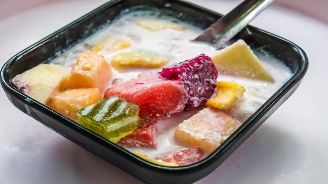 Fruit chunks, jelly cubes, condensed milk, and shaved ice. Perfect when the humidity feels like a blanket.
